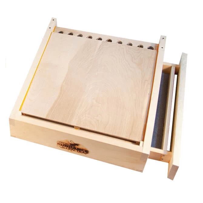 This bottom, side-drawer version features a board that can be moved up to allow the bees to collect pollen or down to allow the bees to bypass the trap. Pollen can be harvested from the drawer without opening the hive. Use of bottom mounted pollen traps prevents monitoring for Varroa mites using screened bottom boards. Complete use and care instructions are included.