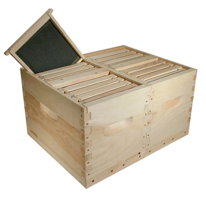 This is the modular system we use in our own queen rearing program. This package includes a four-way bottom board, one divided deep hive body with 2 removable dividers, and 16 assembled half frames with plastic foundation and coated with extra wax. The divided deep is divided down the middle with a solid wood divider that cannot be removed. Two additional dividers further divide the halves into quarters. Each half can hold 10 9″ frames with the dividers removed, or 8 9″ frames (4 per quadrant) with the dividers installed.