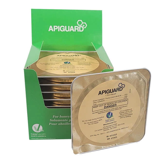 Varroa mites (external parasite) are a destructive pest that has no place in your hive. Kick them out with Apigaurd, a thymol-based miticide suitable for natural use. A 10 pack will treat 5 hives. Need a larger quantity? Apiguard is also available as a 6.6 lb. pail (30 hives)
