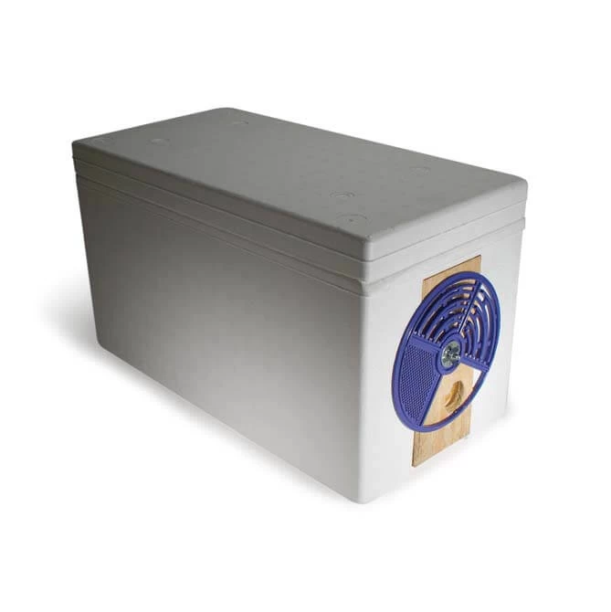These rugged, easy-to-handle polystyrene nuc boxes are perfect for making early or late splits, transferring colonies, or increasing your apiary’s size easily. The assembled BeeMax nuc includes a plastic-lined entrance on one end and a screened ventilation hole on both ends. A Betterbee Hive Portal with four sections (open, queen excluder, drone excluder, and vent-only) is used to control the entrance. We will choose a color for your portal. You can feed directly into the box.