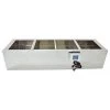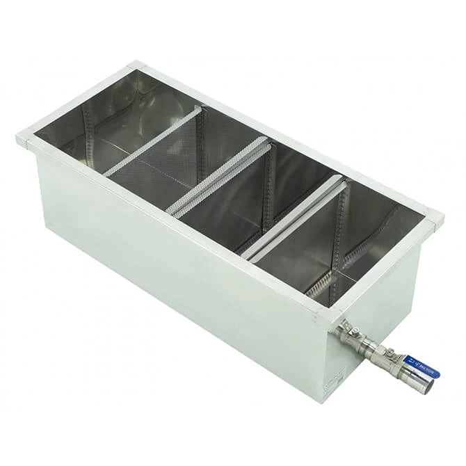 This Lyson unheated honey sump is used to collect honey from extractors and uncapping systems (uncapping tank drains or wax extruder honey). The unit has four chambers with removable perforated baffles to accumulate wax. There is an outlet connection for pumping honey to the final settling/straining/bottling step.