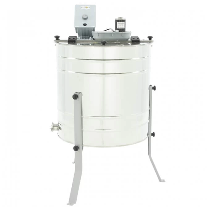 This motorized extractor was developed to extract four deeps or 8 mediums/shallows in a tangential basket. It extracts frames faster due to its larger drum diameter while the smaller dimensions make it easy to move around the honey house!