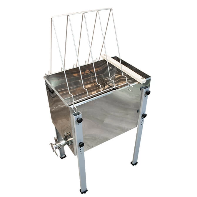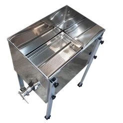 - A stainless steel rectangular tank with a removable grate that sits 2″ above the floor of the tank, allowing honey to collect and drain