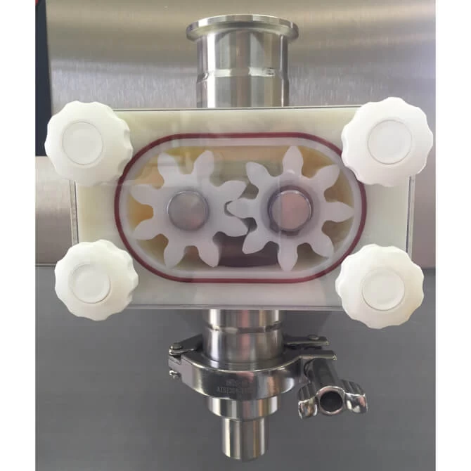 The Lyson Honey Bottler Gear Style uses two hard plastic rotating “gears” or “screws” to dispense honey. One screw is driven by the motor and the second screw turns with the first to move honey. All of the surfaces that come in contact with honey are stainless steel or food safe plastic. Convenient thumb screw knobs allow the unit to be easily disassembled for cleaning.