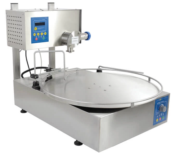 The Lyson Mini Turn Table and Bottler (Lyson W204013) pumps, measures, and dispenses honey or creamed honey into containers. It is actuated by a foot pedal or bottle switch and pumps from a tank into containers. This bottler is programmable and will dispense quantities or buckets from 4g to 45kg (100 lbs).