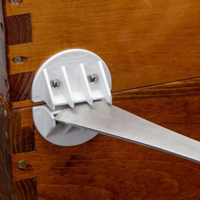 The PryPoint attaches to the top and bottom of each box in one corner of the hive. The beekeeper inserts a hive tool between the halves and with a gentle prying motion, seperates the boxes without upsetting the bees.