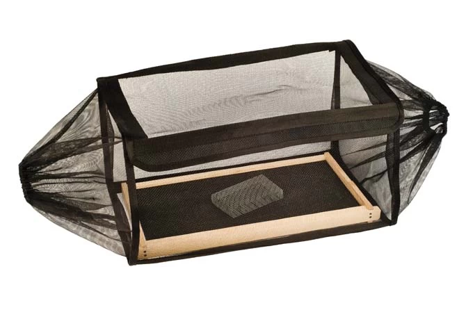 Betterbee has created this queen muff designed to allow queen marking and the removal of attendant bees from queen cages before the queen is introduced to the colony. This muff is unique as it is large enough to accommodate a deep frame (not included). The frame is easily placed in the queen muff by opening a large flap secured with Velcro.